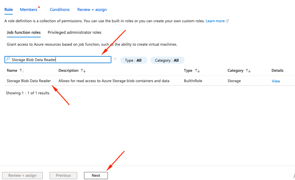 3. Search by role name Storage Blob Data Reader in search box, Select role from the list and click Next Search Role